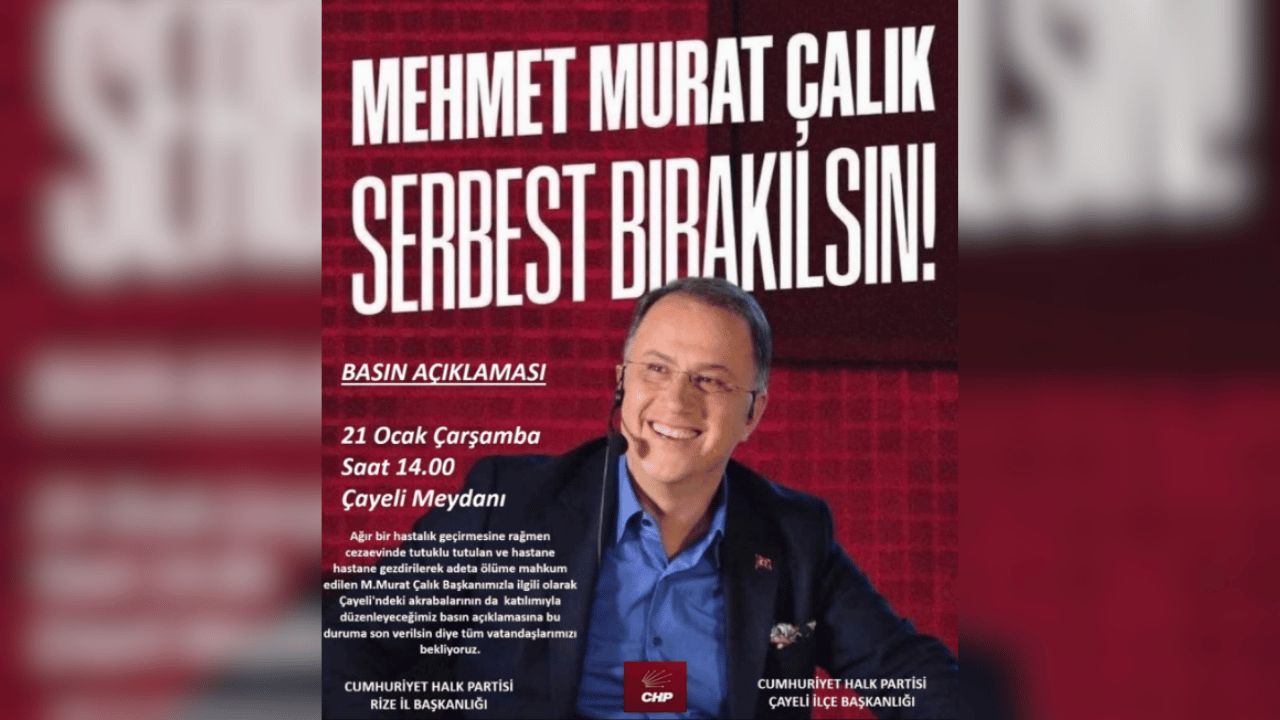 Rize, 20 Ocak 2026 – Cumhuriyet Halk Partisi (CHP) Rize İl Başkanlığı tarafından yapılan paylaşımla, Mehmet Murat Çalık’ın serbest bırakılması talebiyle basın açıklaması yapılacağı duyuruldu.
